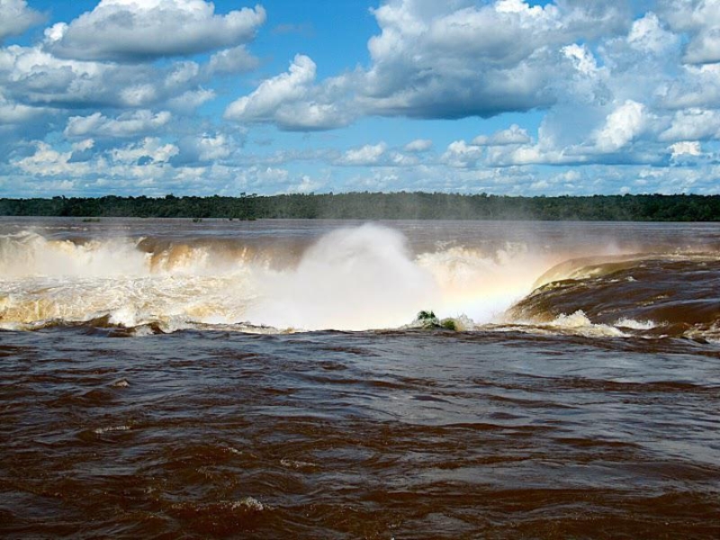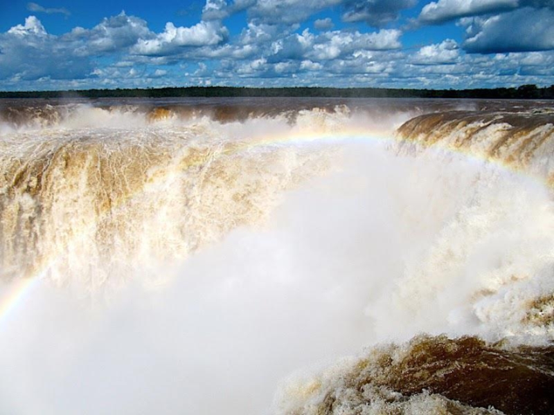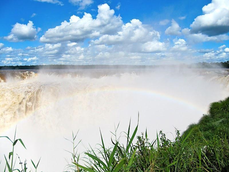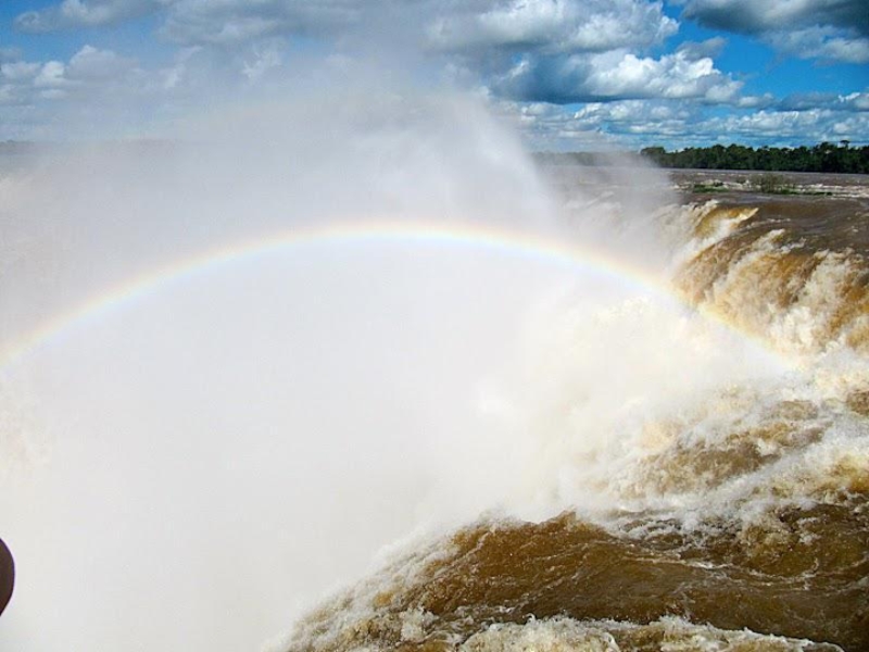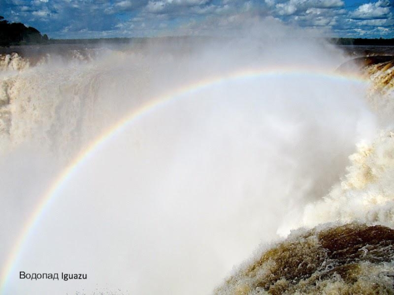 падает вниз и сталкиваясь поднимает вверх фонтан брызг, которые на солнце переливаются и превращаются в белое облако, на котором красуется радуга. Затем брызги рассеиваются и появлялся огромный водопад. И так повторяется постоянно.