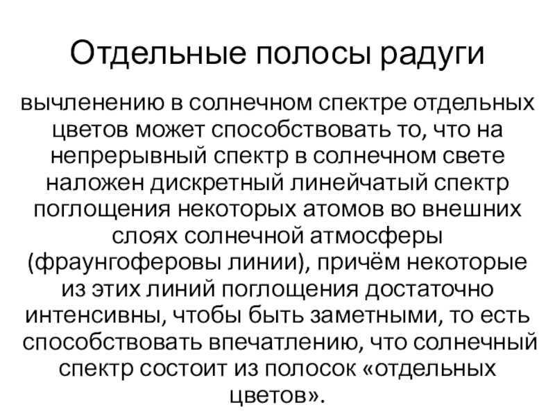 что на непрерывный спектр в солнечном свете наложен дискретный линейчатый спектр поглощения некоторых атомов во внешних слоях солнечной атмосферы (фраунгоферовы линии), причём некоторые из этих линий поглощения достаточно интенсивны, чтобы быть заметными, то есть способствовать впечатлению, что солнечный спектр состоит из полосок «отдельных цветов».