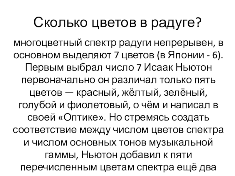 Первым выбрал число 7 Исаак Ньютон первоначально он различал только пять цветов — красный, жёлтый, зелёный, голубой и фиолетовый, о чём и написал в своей «Оптике». Но стремясь создать соответствие между числом цветов спектра и числом основных тонов музыкальной гаммы, Ньютон добавил к пяти перечисленным цветам спектра ещё два