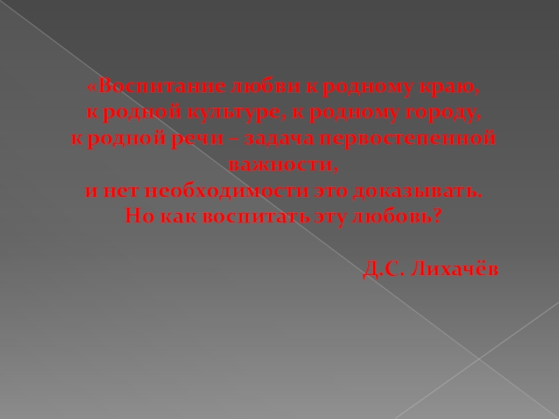 «Воспитание любви к родному краю,к родной культуре, к родному городу,к родной речи – задача первостепенной важности,и нет необходимости это доказывать.Но как воспитать эту любовь?