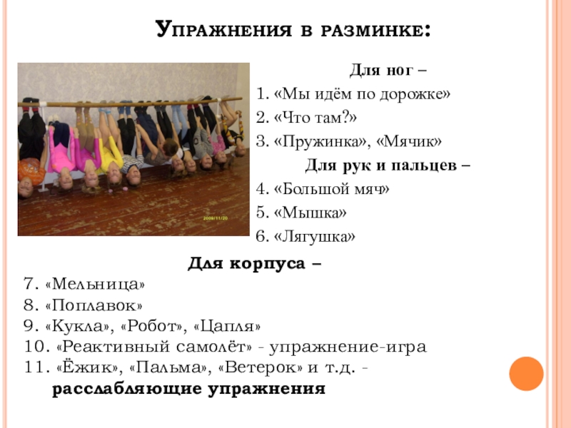 11. «Ёжик», «Пальма», «Ветерок» и т.д. - расслабляющие упражнения