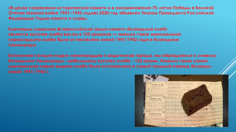 «В целях сохранения исторической памяти и в ознаменование 75-летия Победы в Великой Отечественной войне 1941−1945 годов» 2020 год объявлен Указом Президента Российской Федерации Годом памяти и славы.Ключевым символом Всероссийской акции памяти «Блокадный хлеб»является кусочек хлеба весом