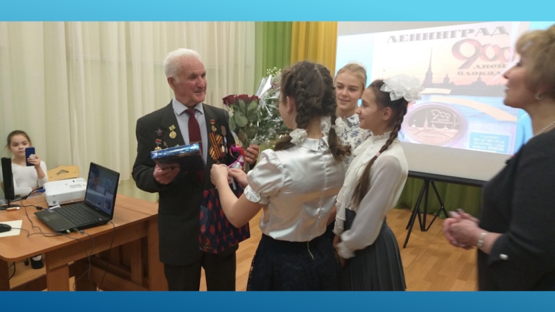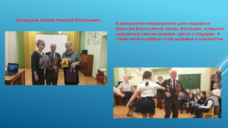 Блокадник Князев Николай ВасильевичВ завершении мероприятия дети подарили Николаю Васильевичу танец «Катюша», открытки сделанные своими руками, цветы