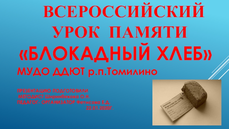 ВСЕРОССИЙСКИЙ    УРОК ПАМЯТИ «БЛОКАДНЫЙ ХЛЕБ» МУДО ДДЮТ р.п.ТомилиноПРЕЗЕНТАЦИЮ ПОДГОТОВИЛИ МЕТОДИСТ Ширинбекова