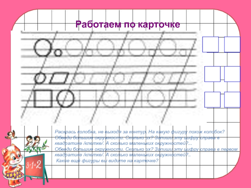 Работаем по карточкеРаскрась колобка, не выходя за контур. На какую фигуру похож колобок? Обведи большие окружности. Сколько