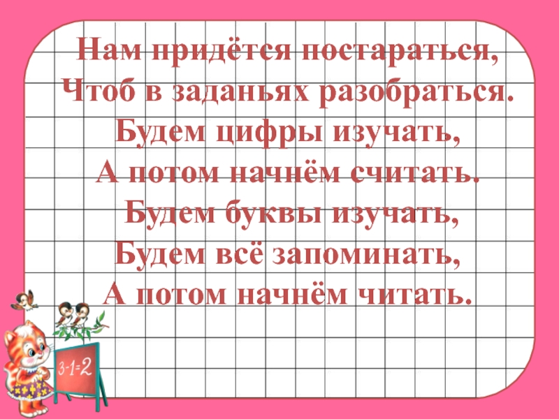 Нам придётся постараться,  Чтоб в заданьях разобраться.  Будем цифры изучать,  А потом начнём считать. Будем буквы изучать,  Будем всё запоминать, А потом начнём читать.