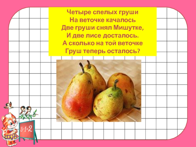 Четыре спелых груши На веточке качалось Две груши снял Мишутке,И две лисе досталось. А сколько на той