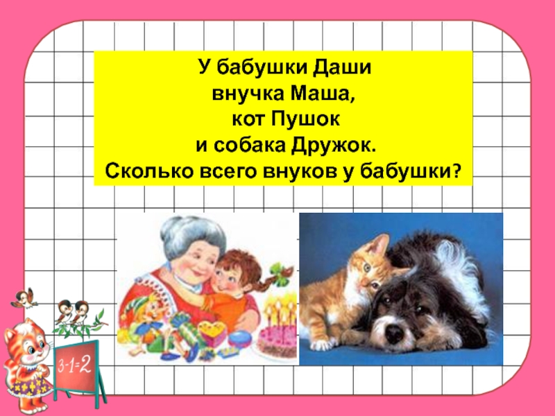 У бабушки Даши внучка Маша, кот Пушок и собака Дружок. Сколько всего внуков у бабушки?