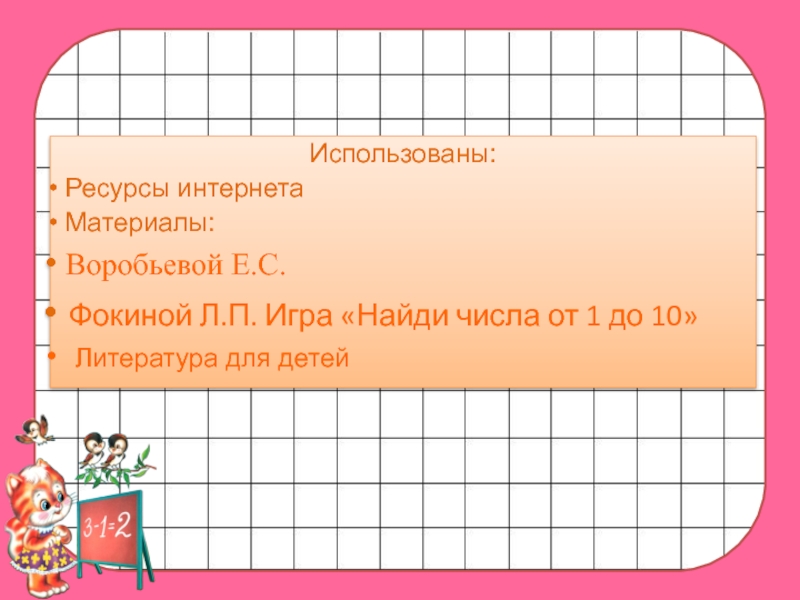 Использованы: Ресурсы интернета Материалы: Воробьевой Е.С. Фокиной Л.П. Игра «Найди числа от 1 до 10» Литература для