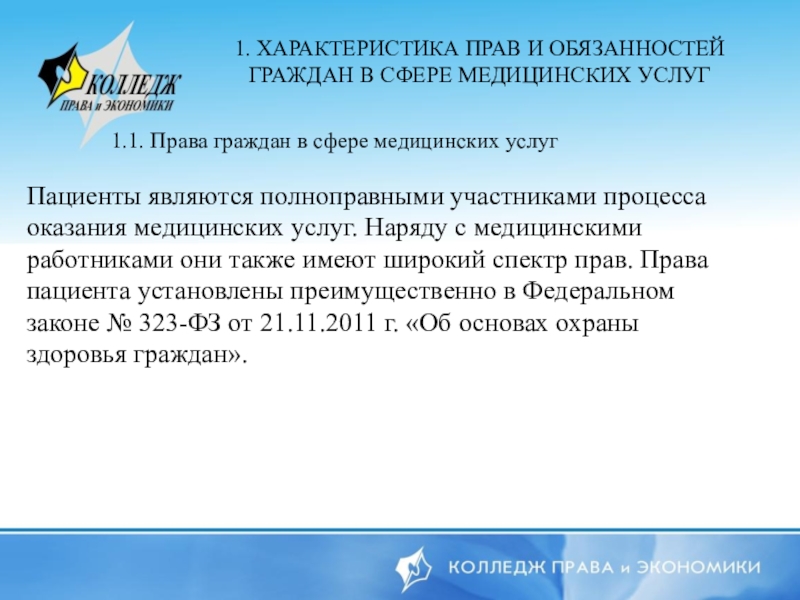 Пациенты являются полноправными участниками процесса оказания медицинских услуг. Наряду с медицинскими работниками они также имеют широкий спектр прав. Права пациента установлены преимущественно в Федеральном законе № 323-ФЗ от 21.11.2011 г. «Об основах охраны здоровья граждан».