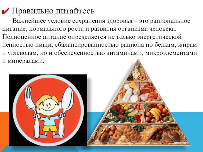 Правильно питайтесь	Важнейшее условие сохранения здоровья – это рациональное питание, нормального роста и развития организма человека. Полноценное питание