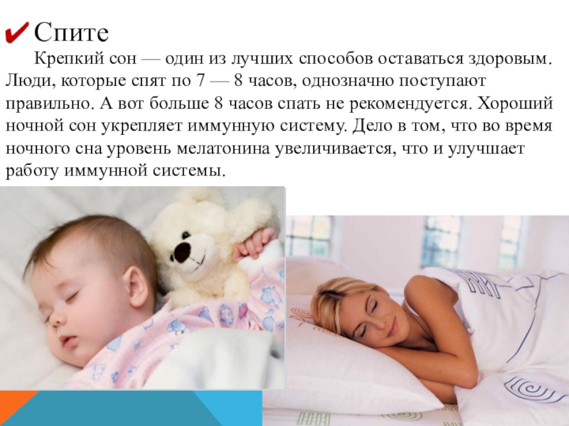 спят по 7 — 8 часов, однозначно поступают правильно. А вот больше 8 часов спать не рекомендуется. Хороший ночной сон укрепляет иммунную систему. Дело в том, что во время ночного сна уровень мелатонина увеличивается, что и улучшает работу иммунной системы.