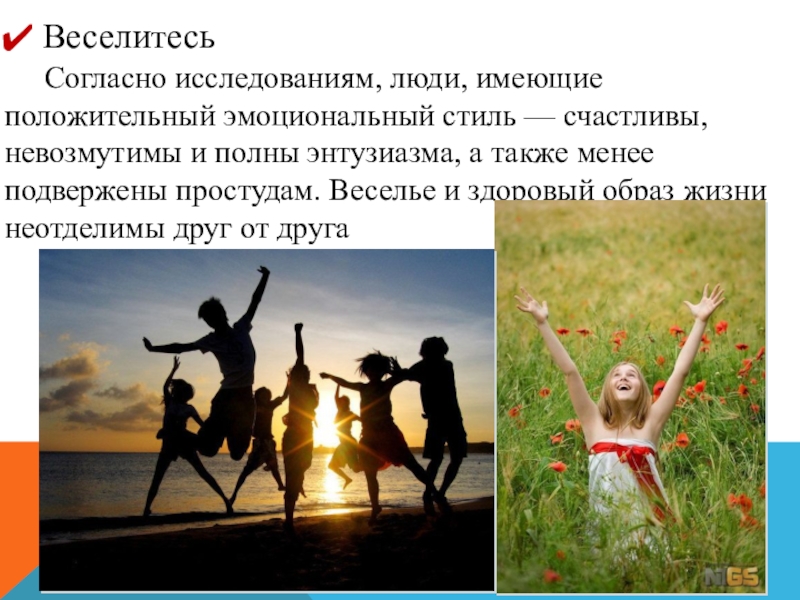 Веселитесь	Согласно исследованиям, люди, имеющие положительный эмоциональный стиль — счастливы, невозмутимы и полны энтузиазма, а также менее подвержены