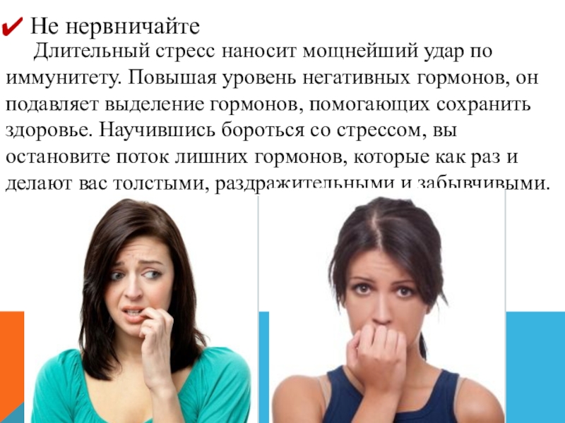 Не нервничайте	Длительный стресс наносит мощнейший удар по иммунитету. Повышая уровень негативных гормонов, он подавляет выделение гормонов, помогающих