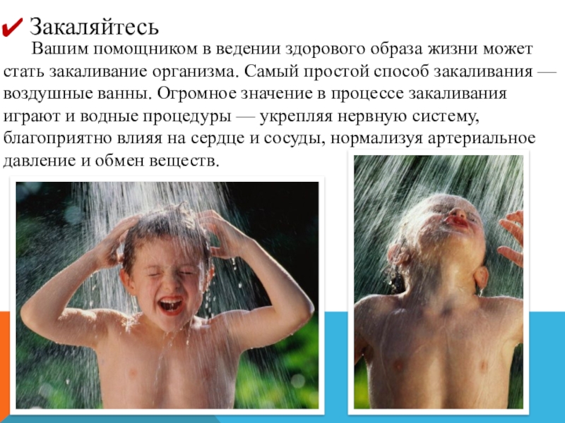 Закаляйтесь	Вашим помощником в ведении здорового образа жизни может стать закаливание организма. Самый простой способ закаливания — воздушные