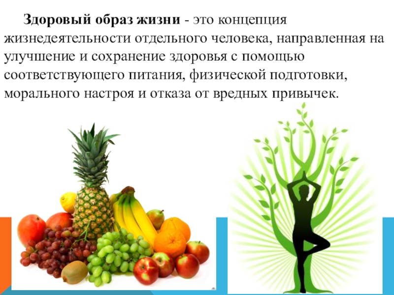 Здоровый образ жизни - это концепция жизнедеятельности отдельного человека, направленная на улучшение и сохранение здоровья с помощью