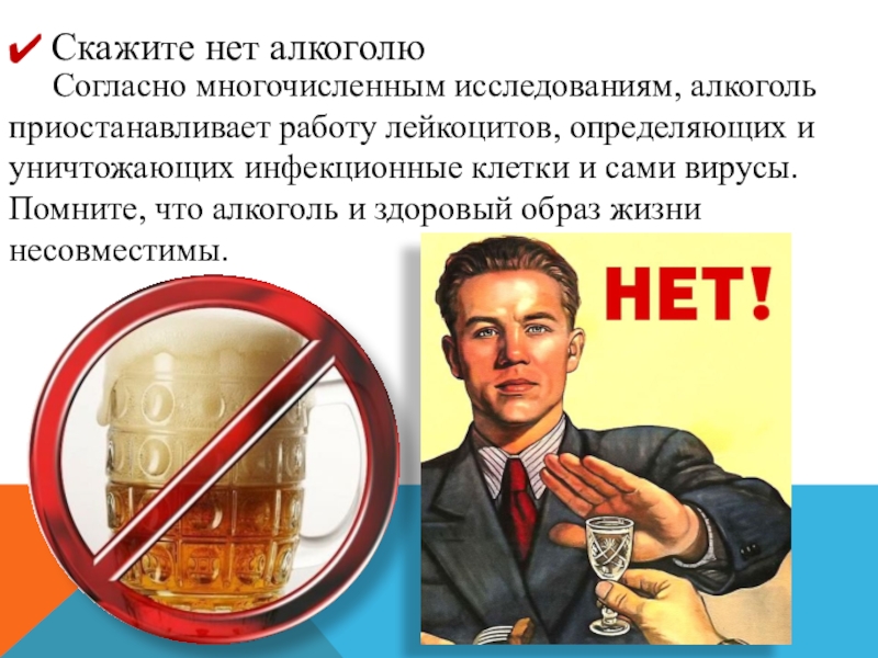 Скажите нет алкоголю	Согласно многочисленным исследованиям, алкоголь приостанавливает работу лейкоцитов, определяющих и уничтожающих инфекционные клетки и сами вирусы.