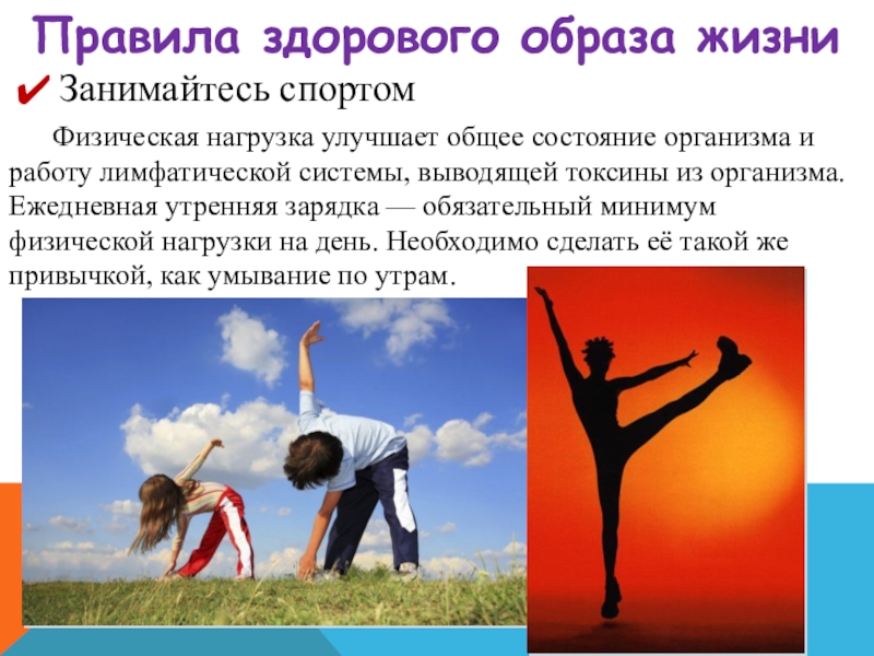Правила здорового образа жизниЗанимайтесь спортом	Физическая нагрузка улучшает общее состояние организма и работу лимфатической системы, выводящей токсины из
