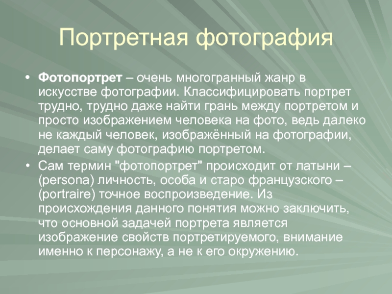 Сам термин "фотопортрет" происходит от латыни – (persona) личность, особа и старо французского – (portraire) точное воспроизведение. Из происхождения данного понятия можно заключить, что основной задачей портрета является изображение свойств портретируемого, внимание именно к персонажу, а не к его окружению.