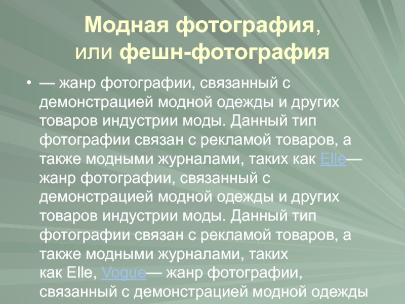других товаров индустрии моды. Данный тип фотографии связан с рекламой товаров, а также модными журналами, таких как Elle— жанр фотографии, связанный с демонстрацией модной одежды и других товаров индустрии моды. Данный тип фотографии связан с рекламой товаров, а также модными журналами, таких как Elle, Vogue— жанр фотографии, связанный с демонстрацией модной одежды и других товаров индустрии моды. Данный тип фотографии связан с рекламой товаров, а также модными журналами, таких как Elle, Vogue, Vanity Fair.