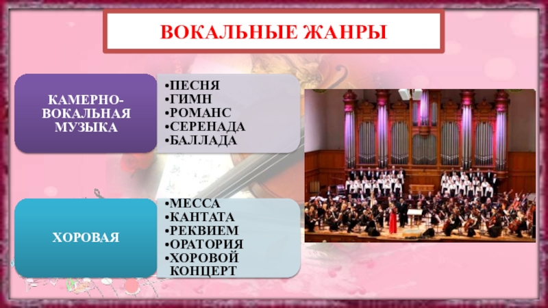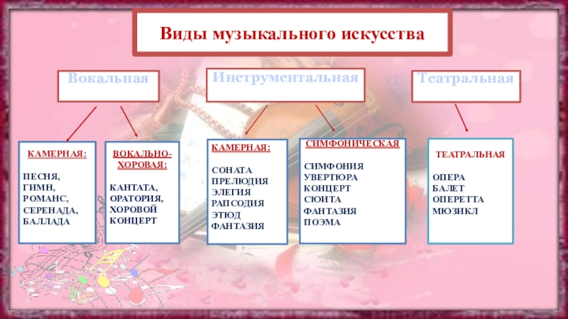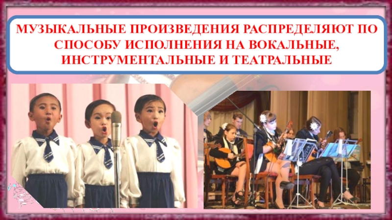 МУЗЫКАЛЬНЫЕ ЖАНРЫ КЛАССИФИЦИРУЮТ ПО ИХ ПРОИСХОЖДЕНИЮ, ИСПОЛНЕНИЮ, ВОСПРИЯТИЮ ИЛИ ПО ДРУГИМ ПРИЗНАКАМ (СОДЕРДАНИЮ, СТРУКТУРЕ, СОСТАВОМ ИСПОЛНИТЕЛЕЙ, ТИПУ ИСПОЛНЕНИЯ).