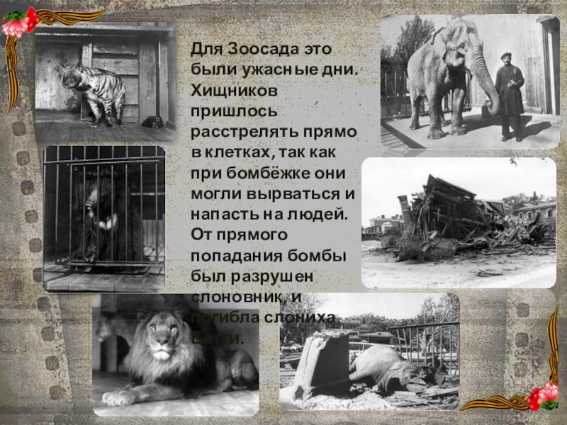 На Ленинградский зоосад (так тогда назывался зоопарк) в первые дни войны попало несколько бомб из-за которых были разрушены несколько зданий.
