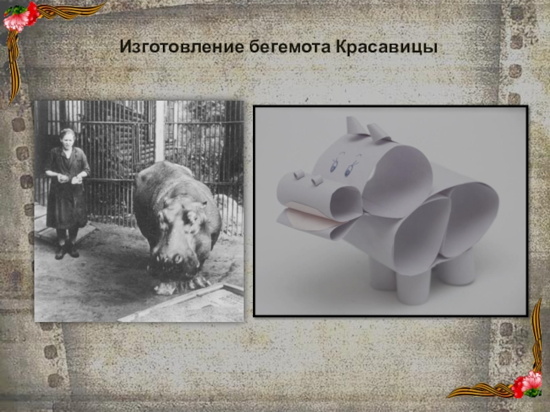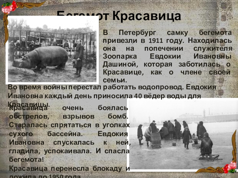 Красавица очень боялась обстрелов, взрывов бомб. Старалась спрятаться в уголках сухого бассейна. Евдокия Ивановна спускалась к ней, гладила, успокаивала. И спасла бегемота!