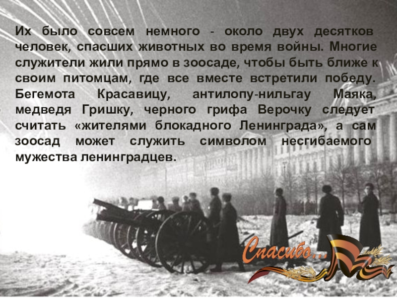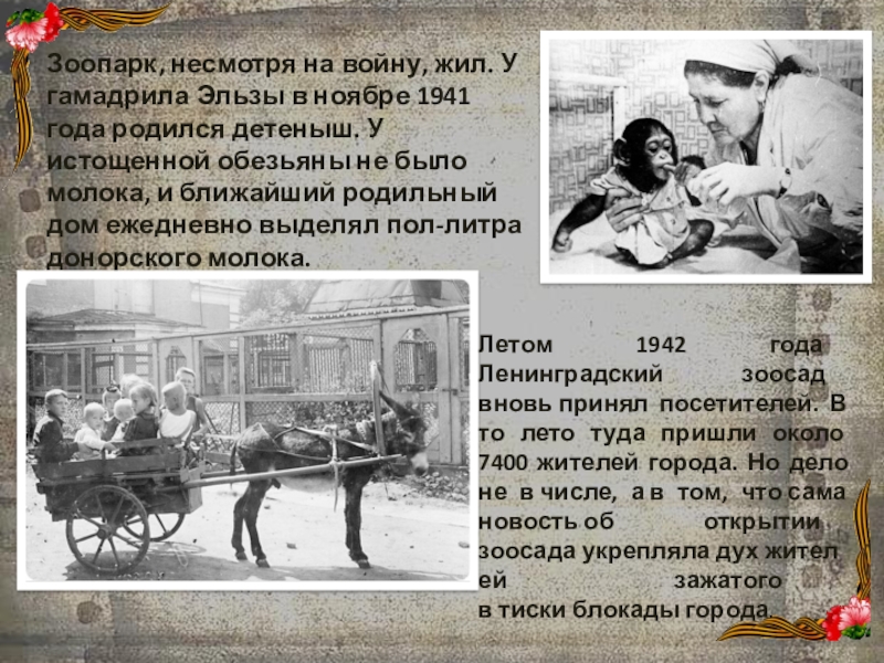 Летом 1942 года Ленинградский зоосад вновь принял посетителей. В то лето туда пришли около 7400 жителей города. Но дело не в числе, а в том, что сама новость об открытии зоосада укрепляла дух жителей зажатого в тиски блокады города.