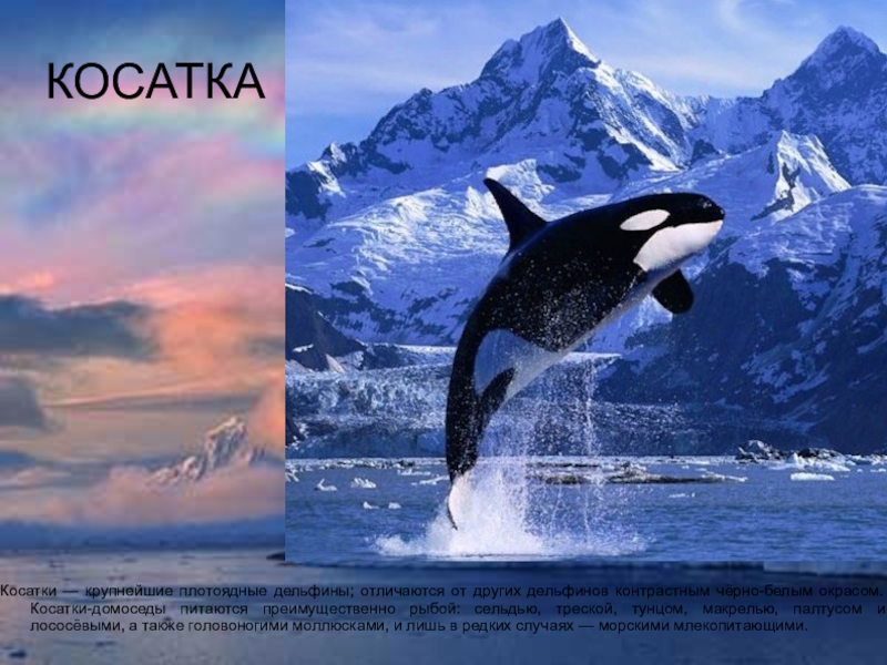 окрасом. Косатки-домоседы питаются преимущественно рыбой: сельдью, треской, тунцом, макрелью, палтусом и лососёвыми, а также головоногими моллюсками, и лишь в редких случаях — морскими млекопитающими.