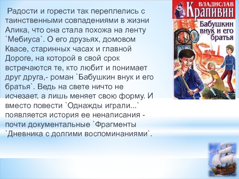Алика, что она стала похожа на ленту `Мeбиуса`. О его друзьях, домовом Квасе, старинных часах и главной Дороге, на которой в свой срок встречаются те, кто любит и понимает друг друга,- роман `Бабушкин внук и его братья`. Ведь на свете ничто не исчезает, а лишь меняет свою форму. И вместо повести `Однажды играли...` появляется история ее ненаписания - почти документальные `Фрагменты `Дневника с долгими воспоминаниями`.