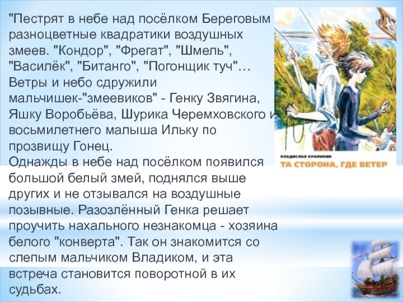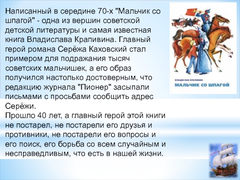 вершин советской детской литературы и самая известная книга Владислава Крапивина. Главный герой романа Серёжа Каховский стал примером для подражания тысяч советских мальчишек, а его образ получился настолько достоверным, что редакцию журнала "Пионер" засыпали письмами с просьбами сообщить адрес Серёжи.