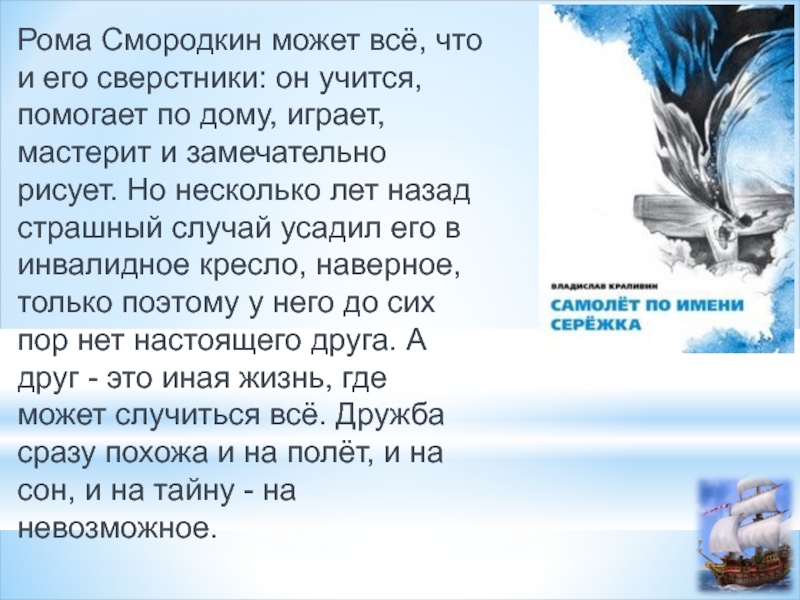 помогает по дому, играет, мастерит и замечательно рисует. Но несколько лет назад страшный случай усадил его в инвалидное кресло, наверное, только поэтому у него до сих пор нет настоящего друга. А друг - это иная жизнь, где может случиться всё. Дружба сразу похожа и на полёт, и на сон, и на тайну - на невозможное.