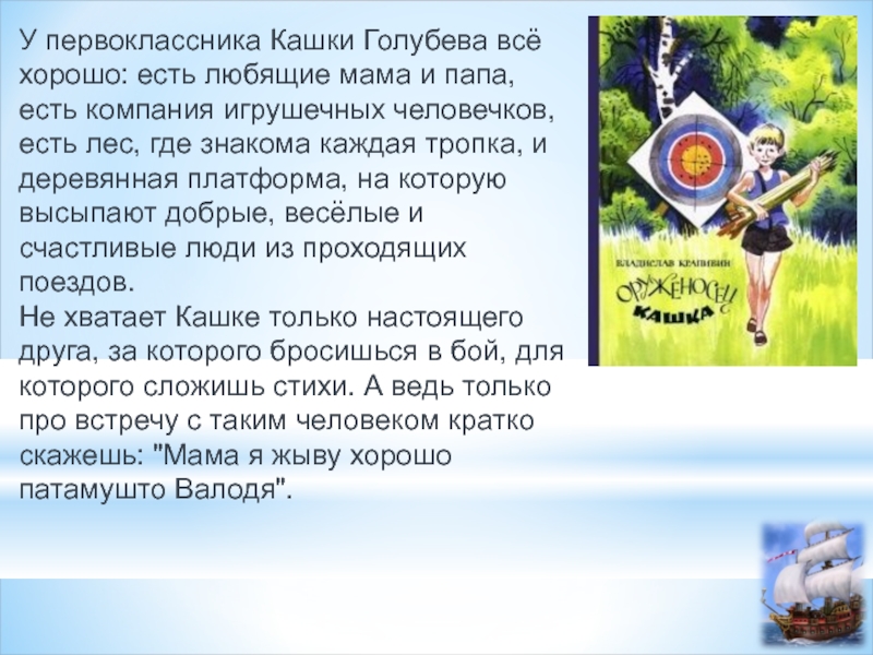 Не хватает Кашке только настоящего друга, за которого бросишься в бой, для которого сложишь стихи. А ведь только про встречу с таким человеком кратко скажешь: "Мама я жыву хорошо патамушто Валодя".