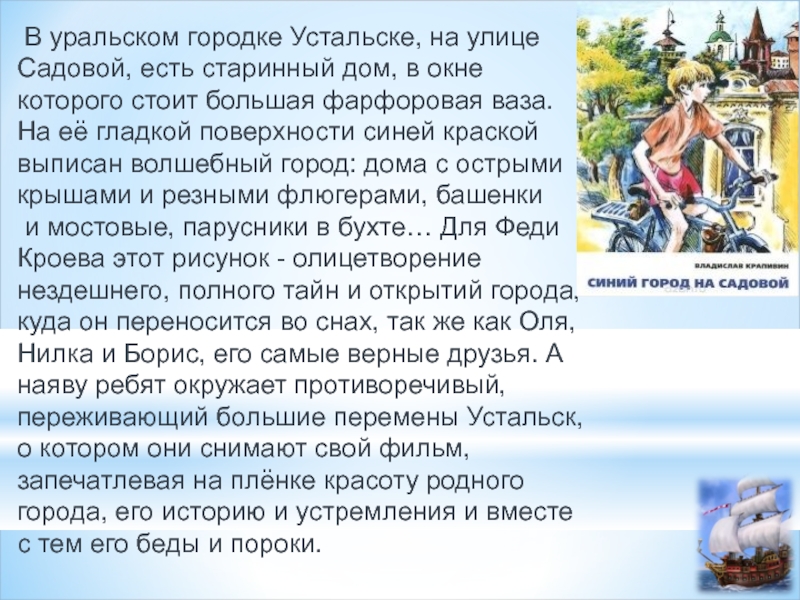 и мостовые, парусники в бухте… Для Феди Кроева этот рисунок - олицетворение нездешнего, полного тайн и открытий города, куда он переносится во снах, так же как Оля, Нилка и Борис, его самые верные друзья. А наяву ребят окружает противоречивый, переживающий большие перемены Устальск, о котором они снимают свой фильм, запечатлевая на плёнке красоту родного города, его историю и устремления и вместе с тем его беды и пороки.