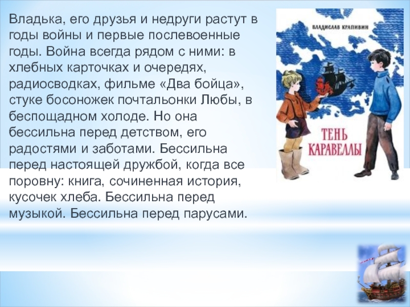 первые послевоенные годы. Война всегда рядом с ними: в хлебных карточках и очередях, радиосводках, фильме «Два бойца», стуке босоножек почтальонки Любы, в беспощадном холоде. Но она бессильна перед детством, его радостями и заботами. Бессильна перед настоящей дружбой, когда все поровну: книга, сочиненная история, кусочек хлеба. Бессильна перед музыкой. Бессильна перед парусами.
