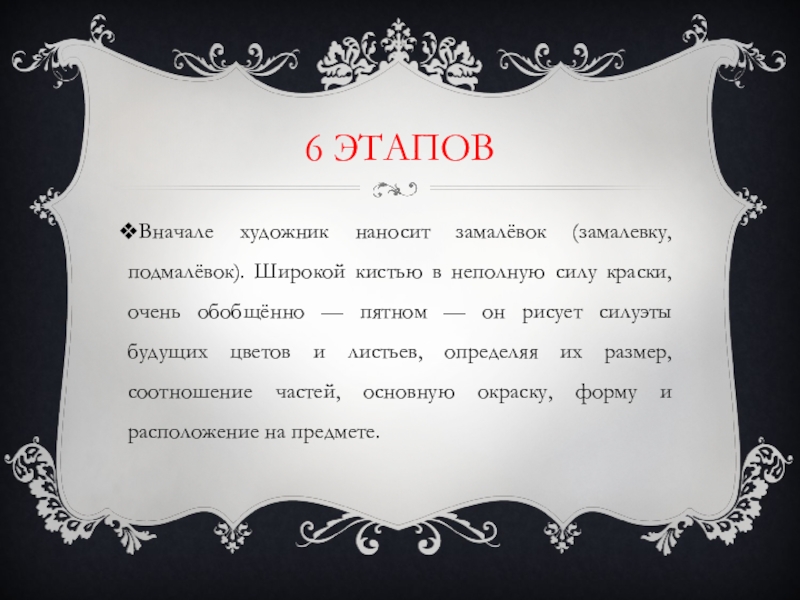 силу краски, очень обобщённо — пятном — он рисует силуэты будущих цветов и листьев, определяя их размер, соотношение частей, основную окраску, форму и расположение на предмете.