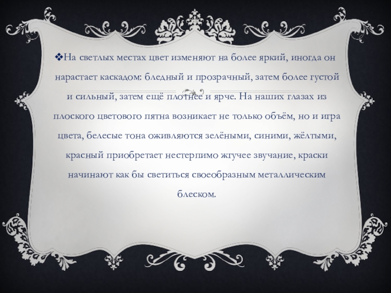 каскадом: бледный и прозрачный, затем более густой и сильный, затем ещё плотнее и ярче. На наших глазах из плоского цветового пятна возникает не только объём, но и игра цвета, белесые тона оживляются зелёными, синими, жёлтыми, красный приобретает нестерпимо жгучее звучание, краски начинают как бы светиться своеобразным металлическим блеском.