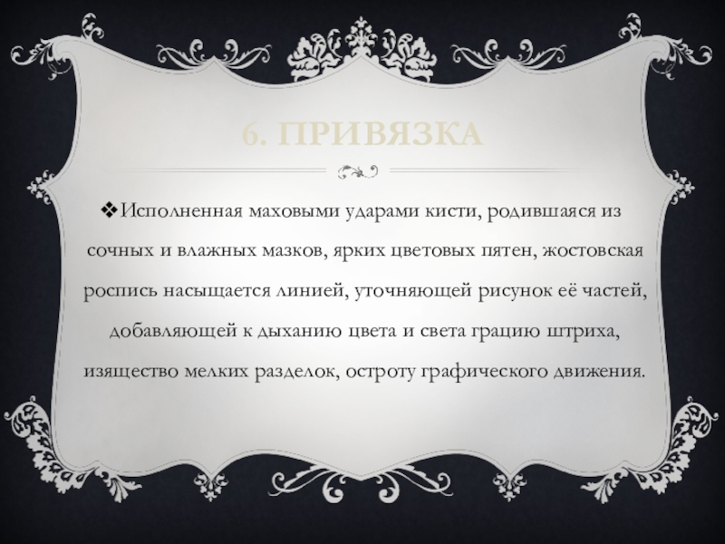 ярких цветовых пятен, жостовская роспись насыщается линией, уточняющей рисунок её частей, добавляющей к дыханию цвета и света грацию штриха, изящество мелких разделок, остроту графического движения.
