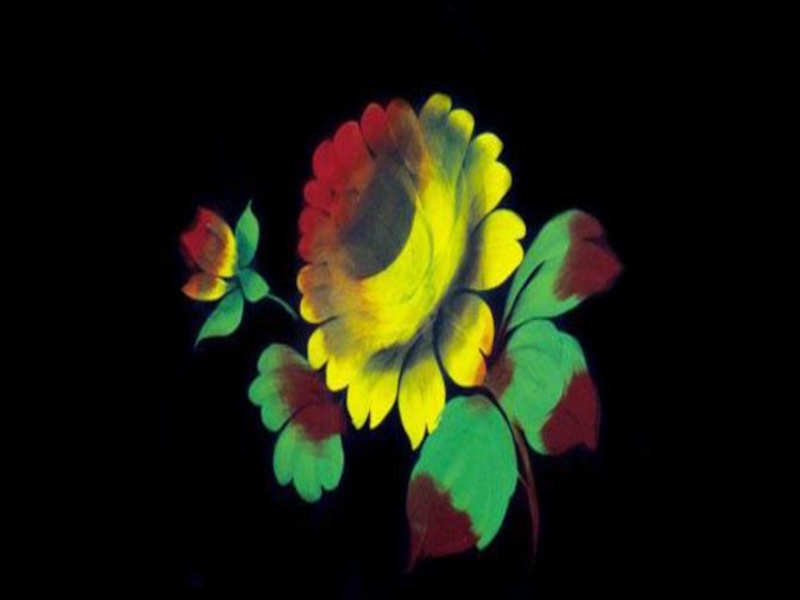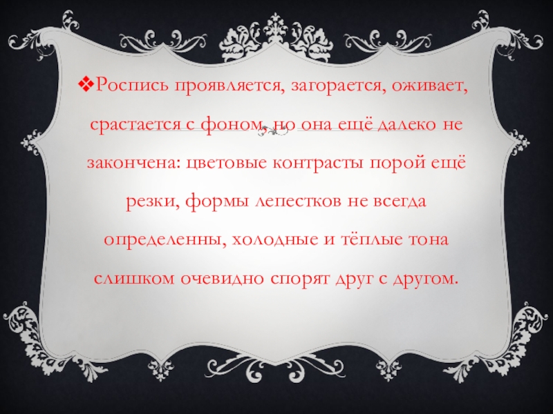 Слайд 11Роспись проявляется, загорается, оживает, срастается с фоном, но она ещё далеко