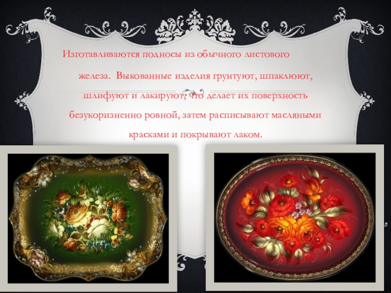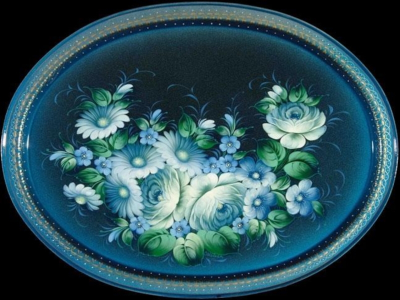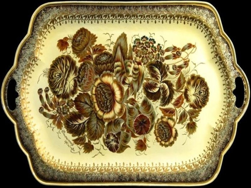и объёма. Оно блёкло, так как каждый мотив сделан одним цветным тоном, без игры оттенков и света. Замалевываются обычно сразу несколько подносов, которые потом сушат в специальных шкафах, чтобы краски стали тоньше, «вжухли», впитавшись в фон.