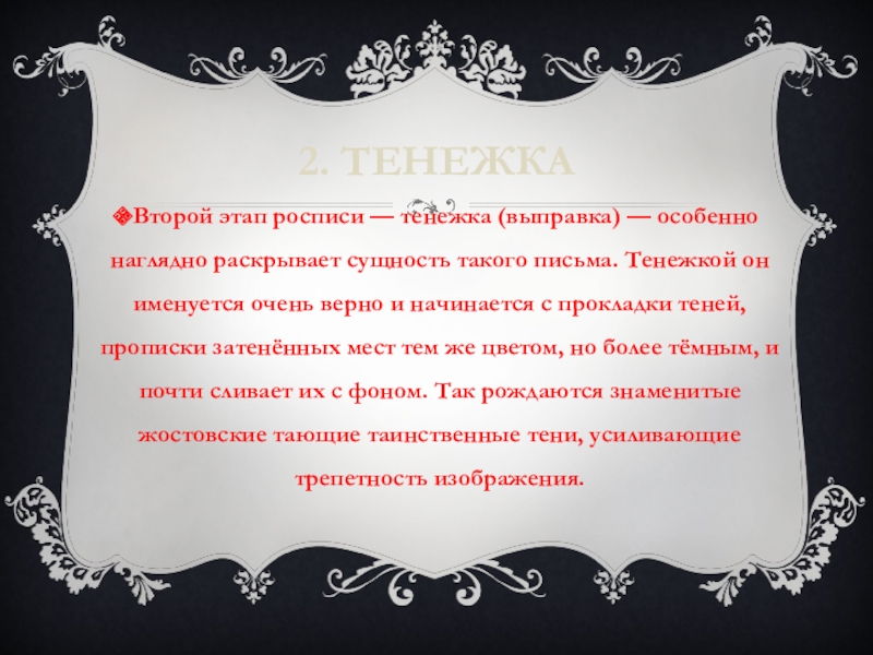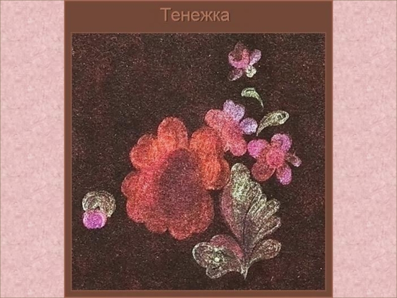 сущность такого письма. Тенежкой он именуется очень верно и начинается с прокладки теней, прописки затенённых мест тем же цветом, но более тёмным, и почти сливает их с фоном. Так рождаются знаменитые жостовские тающие таинственные тени, усиливающие трепетность изображения.