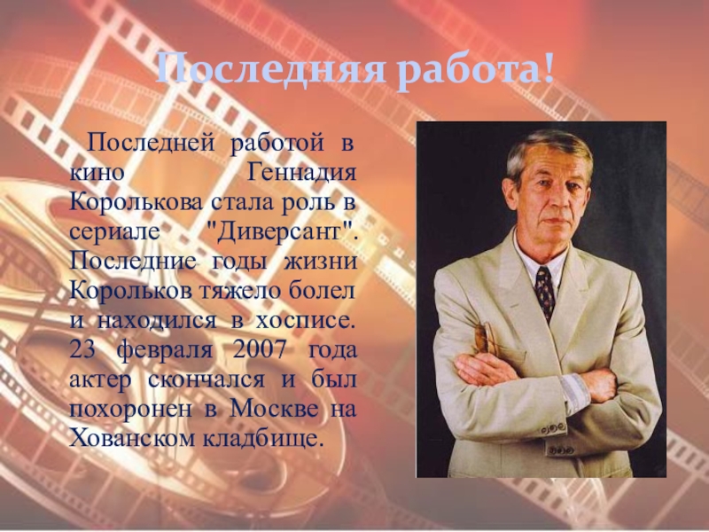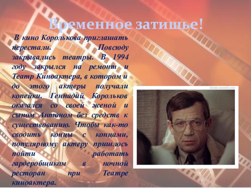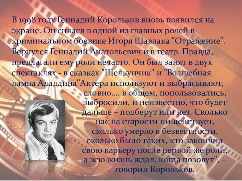 В 1998 году Геннадий Корольков вновь появился на экране. Он снялся в одной из главных ролей в криминальном боевике Игоря Шавлака "Отражение". Вернулся Геннадий Анатольевич и в театр. Правда, предлагали ему роли нечасто. Он был занят в двух спектаклях - в сказках "Щелкунчик" и "Волшебная лампа Аладдина".