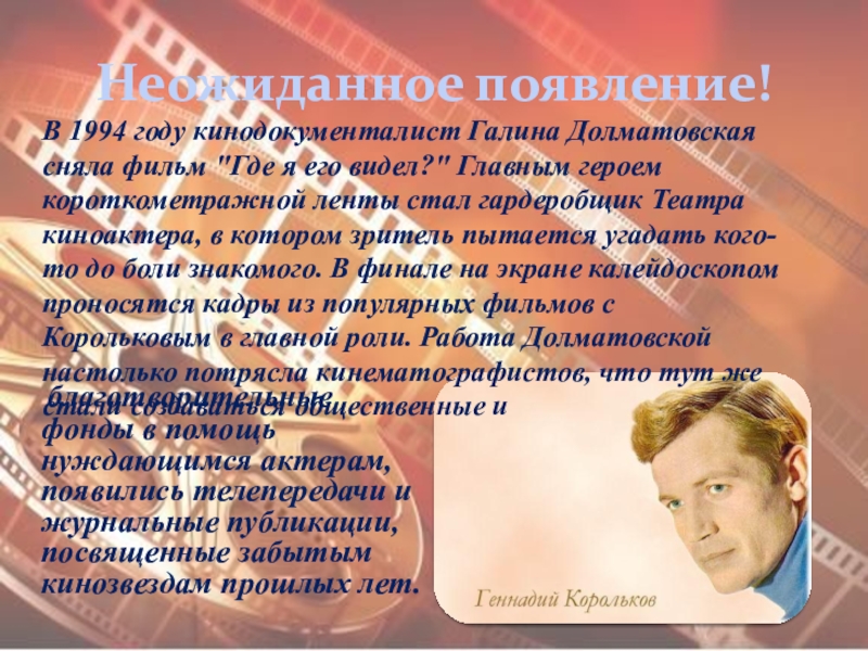 В 1994 году кинодокументалист Галина Долматовская сняла фильм "Где я его видел?" Главным героем короткометражной ленты стал гардеробщик Театра киноактера, в котором зритель пытается угадать кого-то до боли знакомого. В финале на экране калейдоскопом проносятся кадры из популярных фильмов с Корольковым в главной роли. Работа Долматовской настолько потрясла кинематографистов, что тут же стали создаваться общественные и