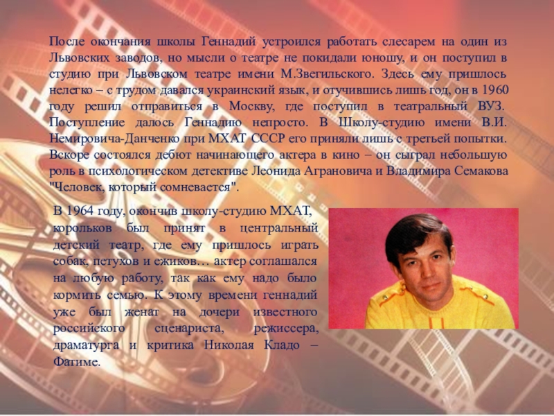 После окончания школы Геннадий устроился работать слесарем на один из Львовских заводов, но мысли о театре не покидали юношу, и он поступил в студию при Львовском театре имени М.Звегильского. Здесь ему пришлось нелегко – с трудом давался украинский язык, и отучившись лишь год, он в 1960 году решил отправиться в Москву, где поступил в театральный ВУЗ. Поступление далось Геннадию непросто. В Школу-студию имени В.И.Немировича-Данченко при МХАТ СССР его приняли лишь с третьей попытки. Вскоре состоялся дебют начинающего актера в кино – он сыграл небольшую роль в психологическом детективе Леонида Аграновича и Владимира Семакова "Человек, который сомневается".