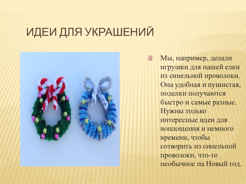 Идеи для украшенийМы, например, делали игрушки для нашей елки из синельной проволоки. Она удобная и пушистая, поделки