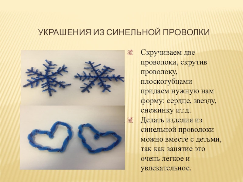 Украшения из синельной проволкиСкручиваем две проволоки, скрутив проволоку, плоскогубцами придаем нужную нам форму: сердце, звезду, снежинку ит.д.Делать