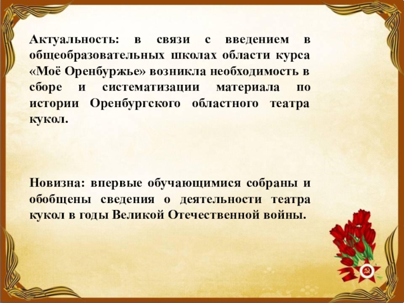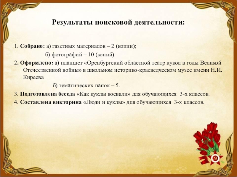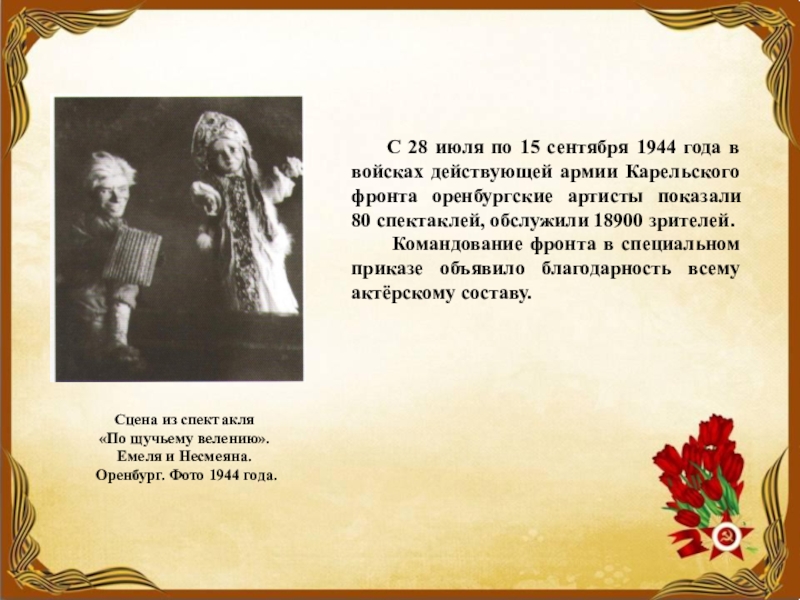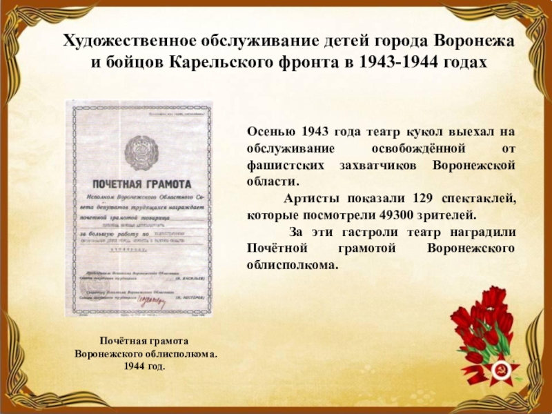 Осенью 1943 года театр кукол выехал на обслуживание освобождённой от фашистских захватчиков Воронежской области.