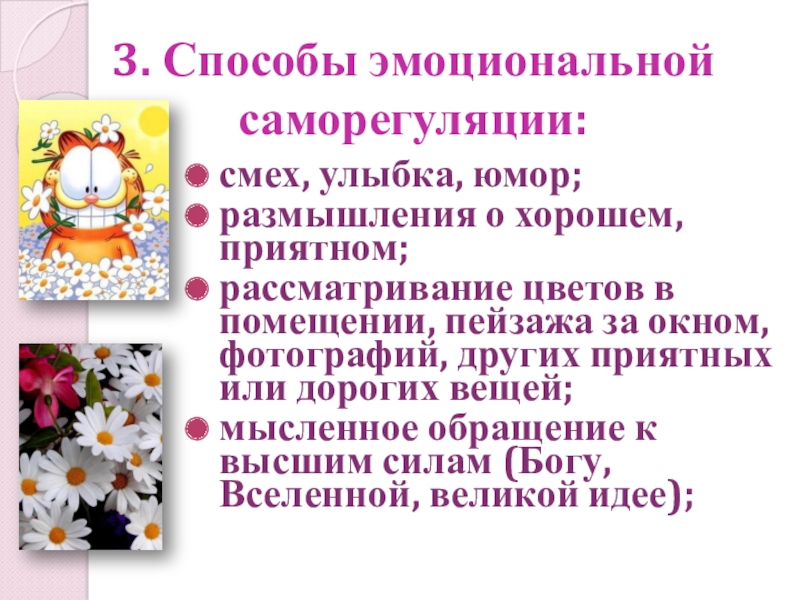 3. Способы эмоциональной саморегуляции:смех, улыбка, юмор;размышления о хорошем, приятном;рассматривание цветов в помещении, пейзажа за окном, фотографий, других