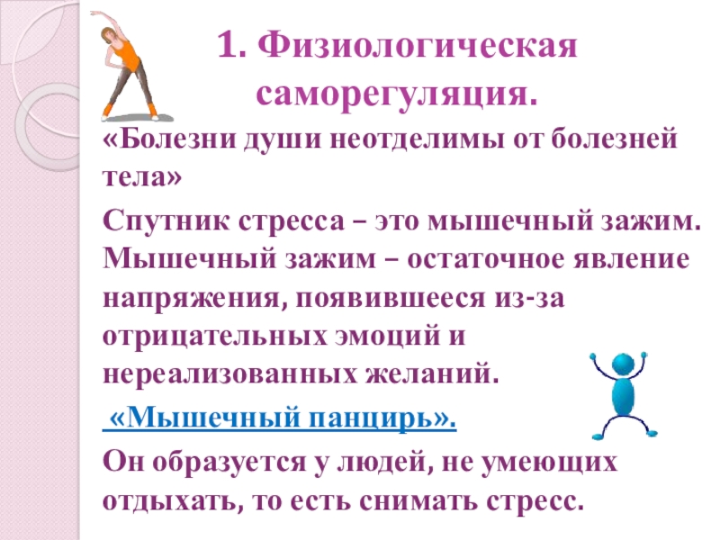 1. Физиологическая саморегуляция.«Болезни души неотделимы от болезней тела»Спутник стресса – это мышечный зажим. Мышечный зажим – остаточное
