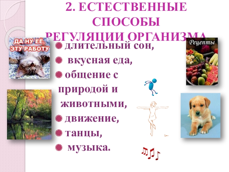 2. ЕСТЕСТВЕННЫЕ СПОСОБЫ РЕГУЛЯЦИИ ОРГАНИЗМА длительный сон, вкусная еда,общение с природой и животными,движение, танцы, музыка.